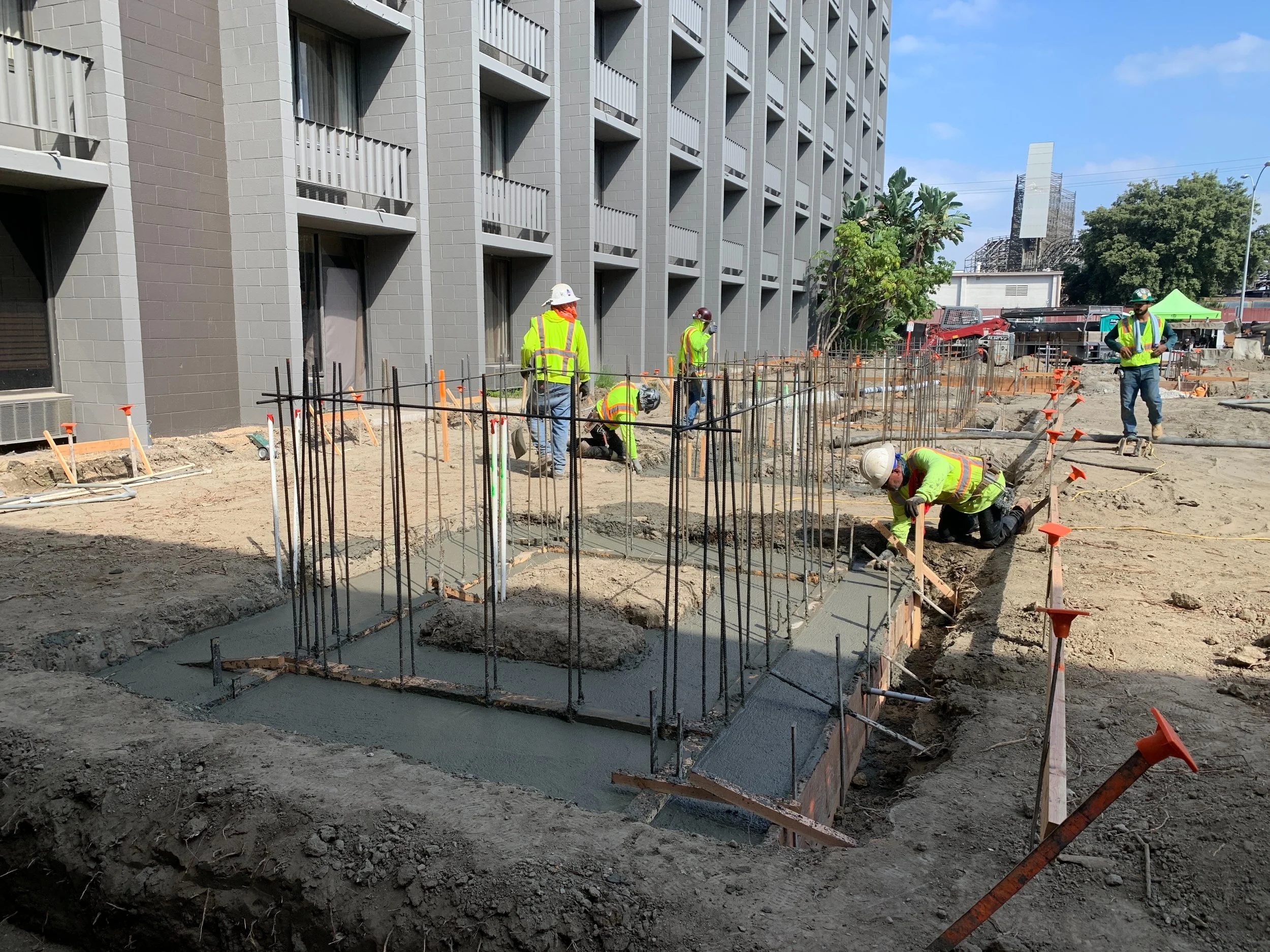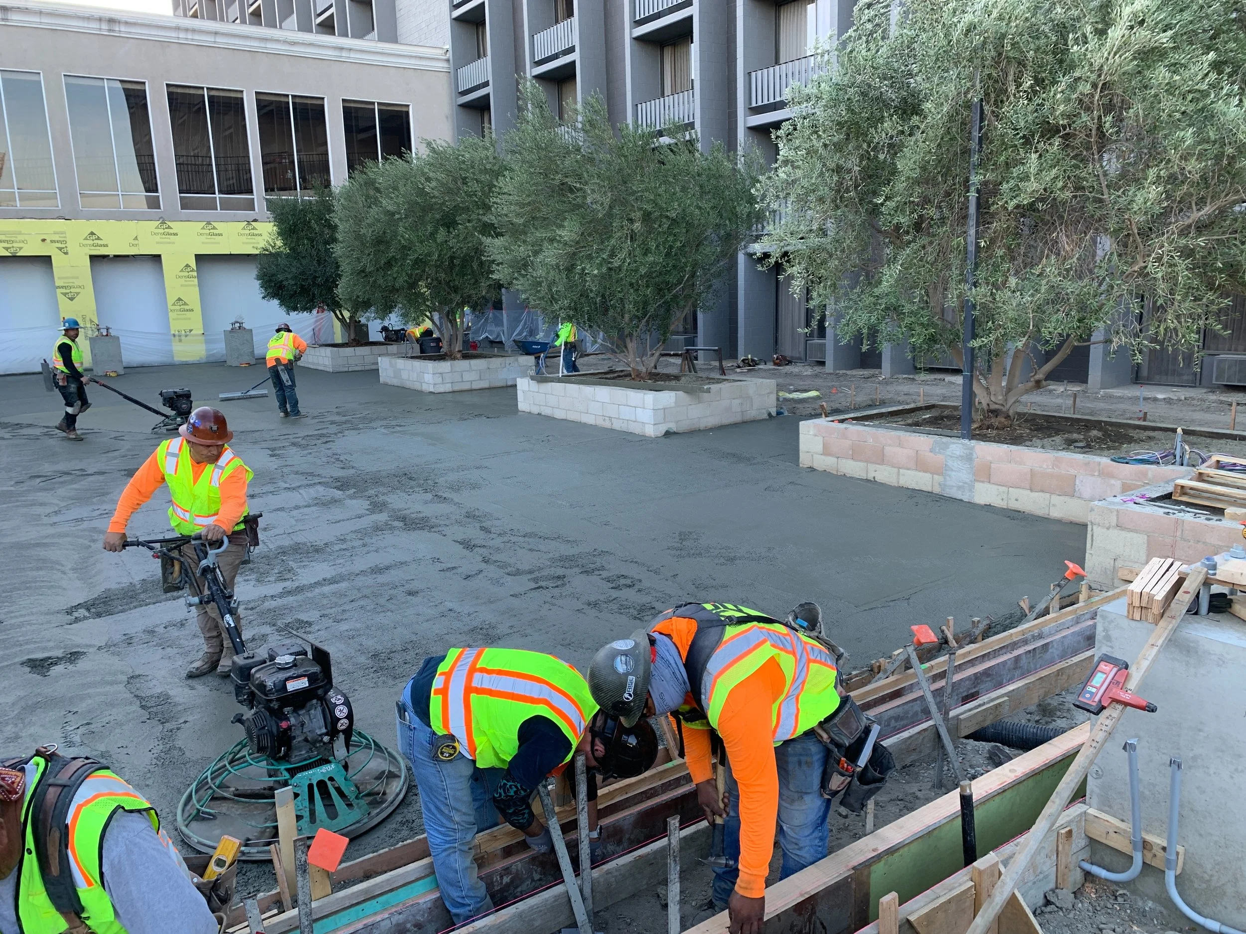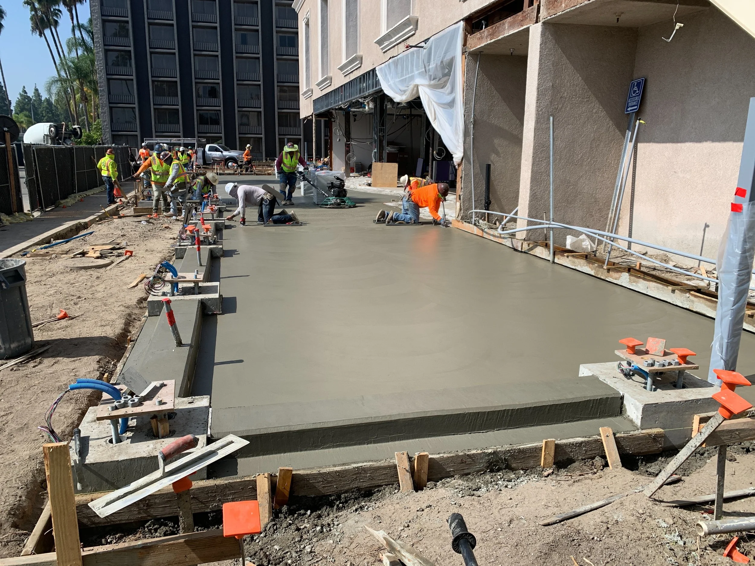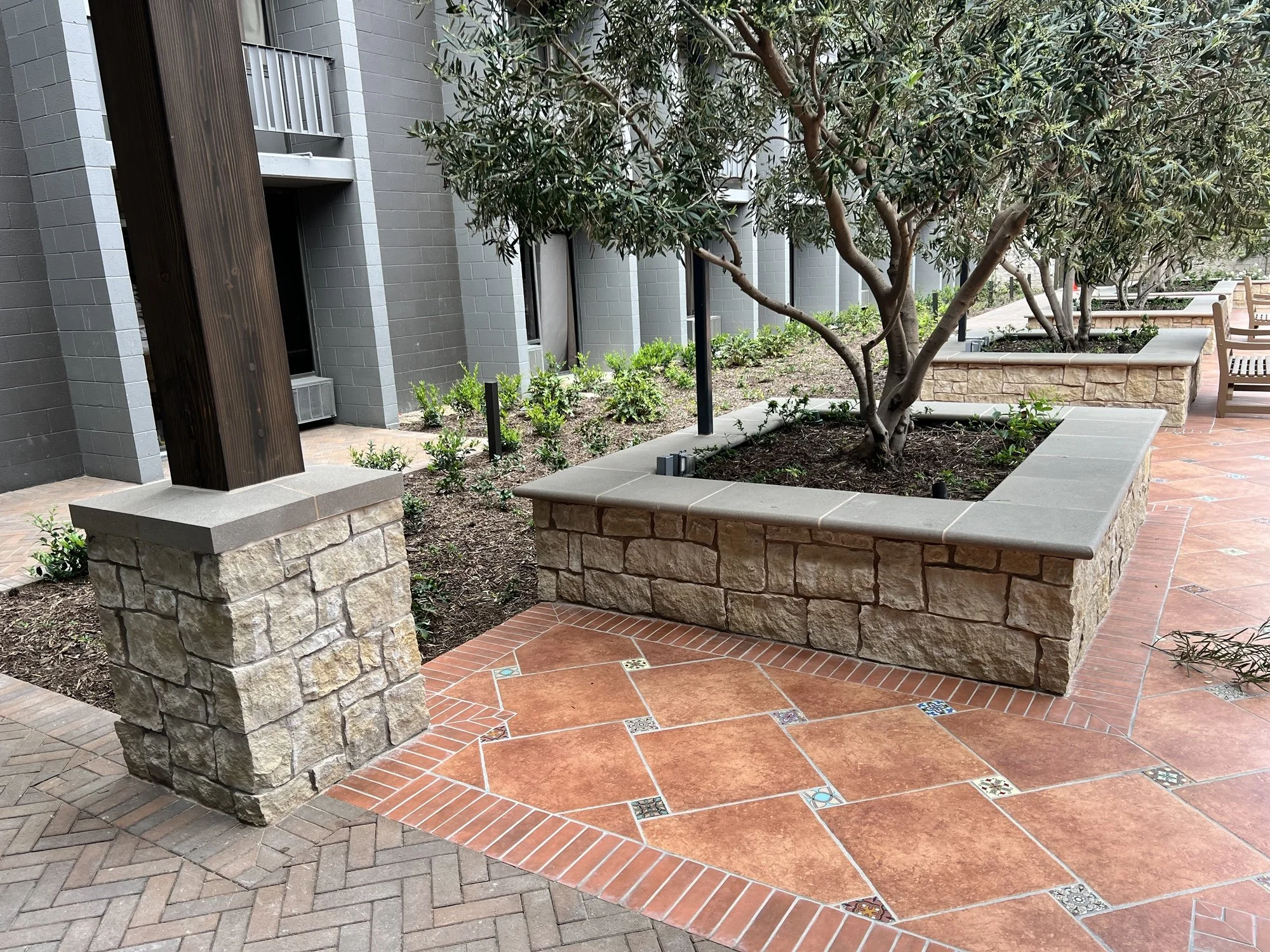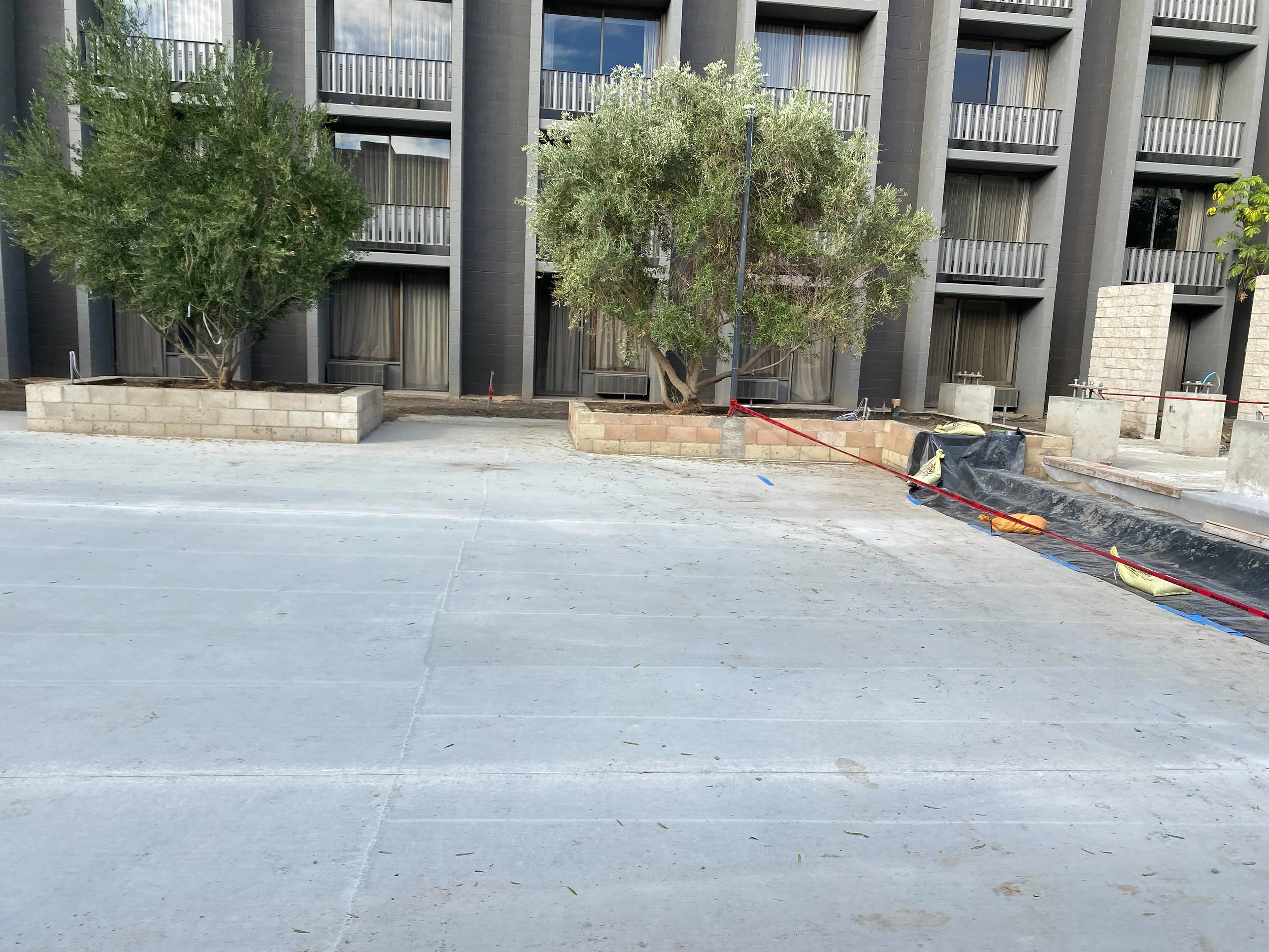 HBA was tasked with site improvements to an existing hotel. Scope of work included new stamp concrete flatwork at the Porta Cochere, natural stone veneer at column bases and new exterior fireplace. Pre-cast column caps, fireplace caps, and wall caps. And pouring of release finish concrete flatwork walk ways.